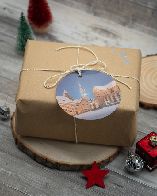 Set aus vier Geschenkanhängern mit dem Burgplatz im Schnee.