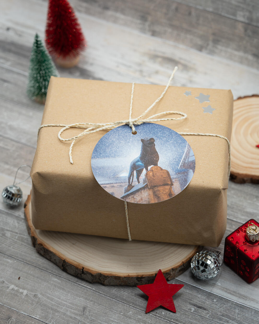 Set aus vier Geschenkanhängern mit dem Burglöwen im Schneesturm.